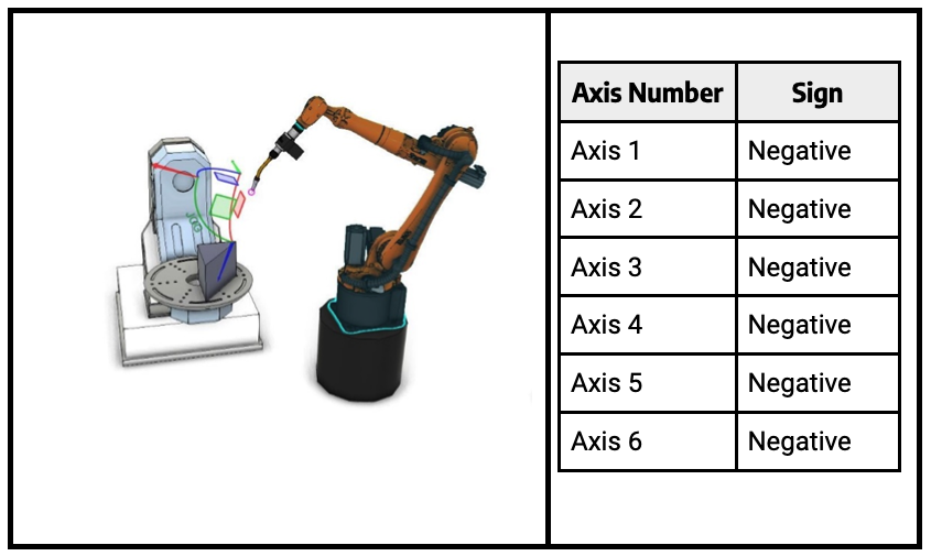 An example of this gets shown in "Table 1". In all these images, the robot is at the same position in space, the only difference being the robot configuration. "Table 1" displays this by showing the sign differences of the individual six-axis positions. A negative sign is an anticlockwise rotation around the axis center point, and a positive sign is a clockwise rotation about its center point.
